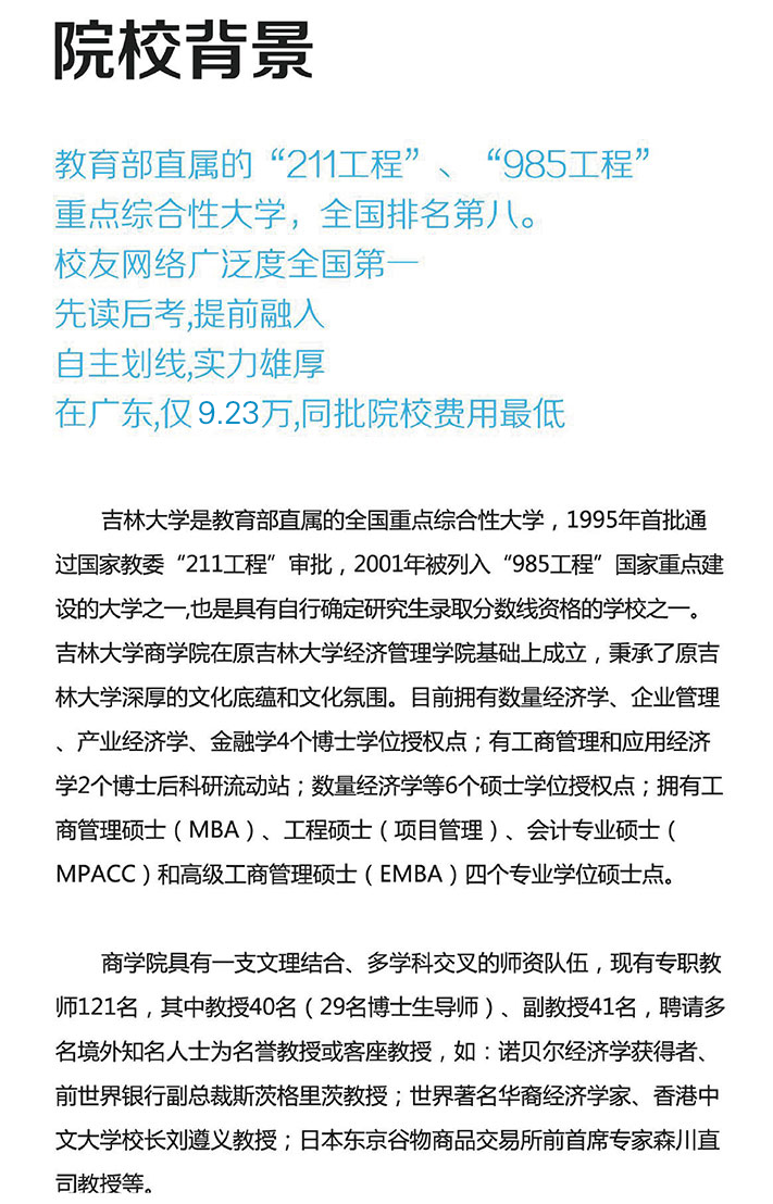吉林大学于1995年首批通过国家教委“211工程”审批,2001年被列入“985工程”国家重点建设的大学之一。1997年获批开办MBA,同期获批有中山大学等29所院校。学费方面,在广州地区985院校只有2个学校-中大、华工,均在10万以上,中大更高达16.5万,而吉大MBA广州班只需9.23万,广州地区同等实力院校费用最低。